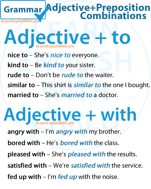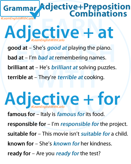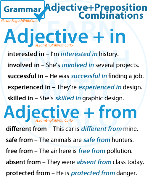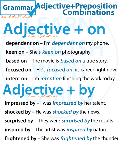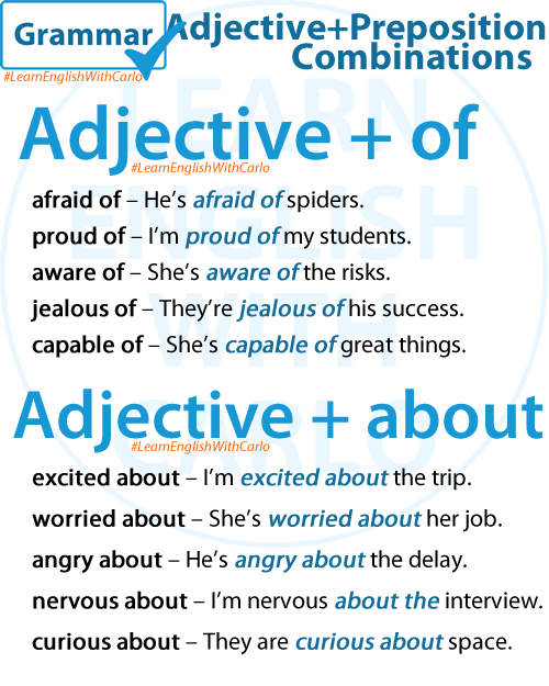 Mastering adjective + preposition combinations is an important step toward sounding natural and confident in English. These expressions—like interested in, good at, or afraid of—are common in everyday conversation, but they don’t always follow clear rules. That’s why it helps to learn them in groups. Below, you’ll find examples organized by preposition to help you understand how they work and remember them more easily.